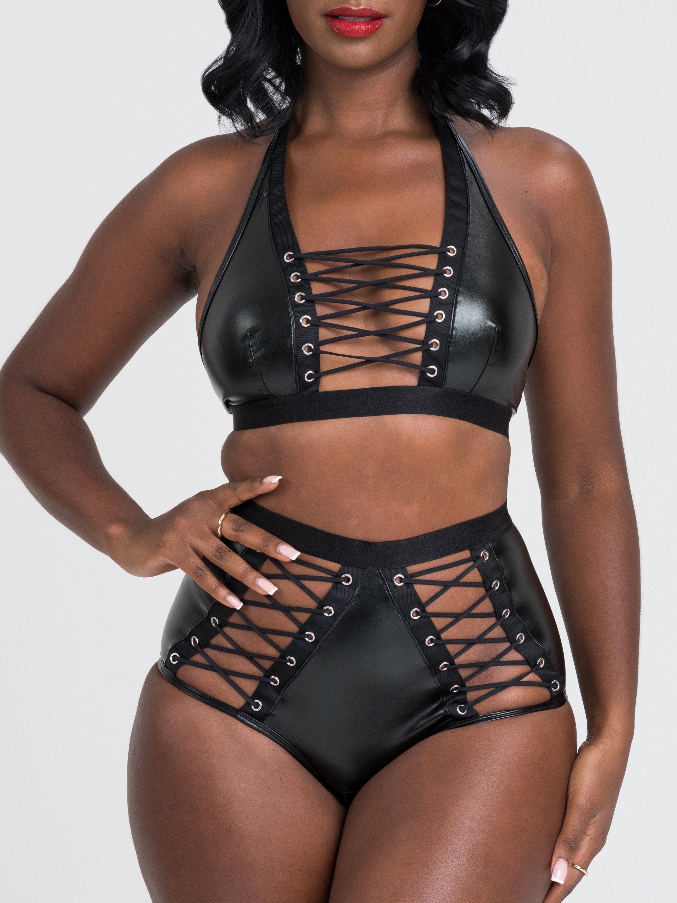 Embrace the power of your intimateity with our Fierce leather-look lace-up bra set. Made from soft faux leather with lace-up and metal eyelet detailing, halterneck ties and high-waisted knickers, it's all you need to make eyes pop and jaws drop.