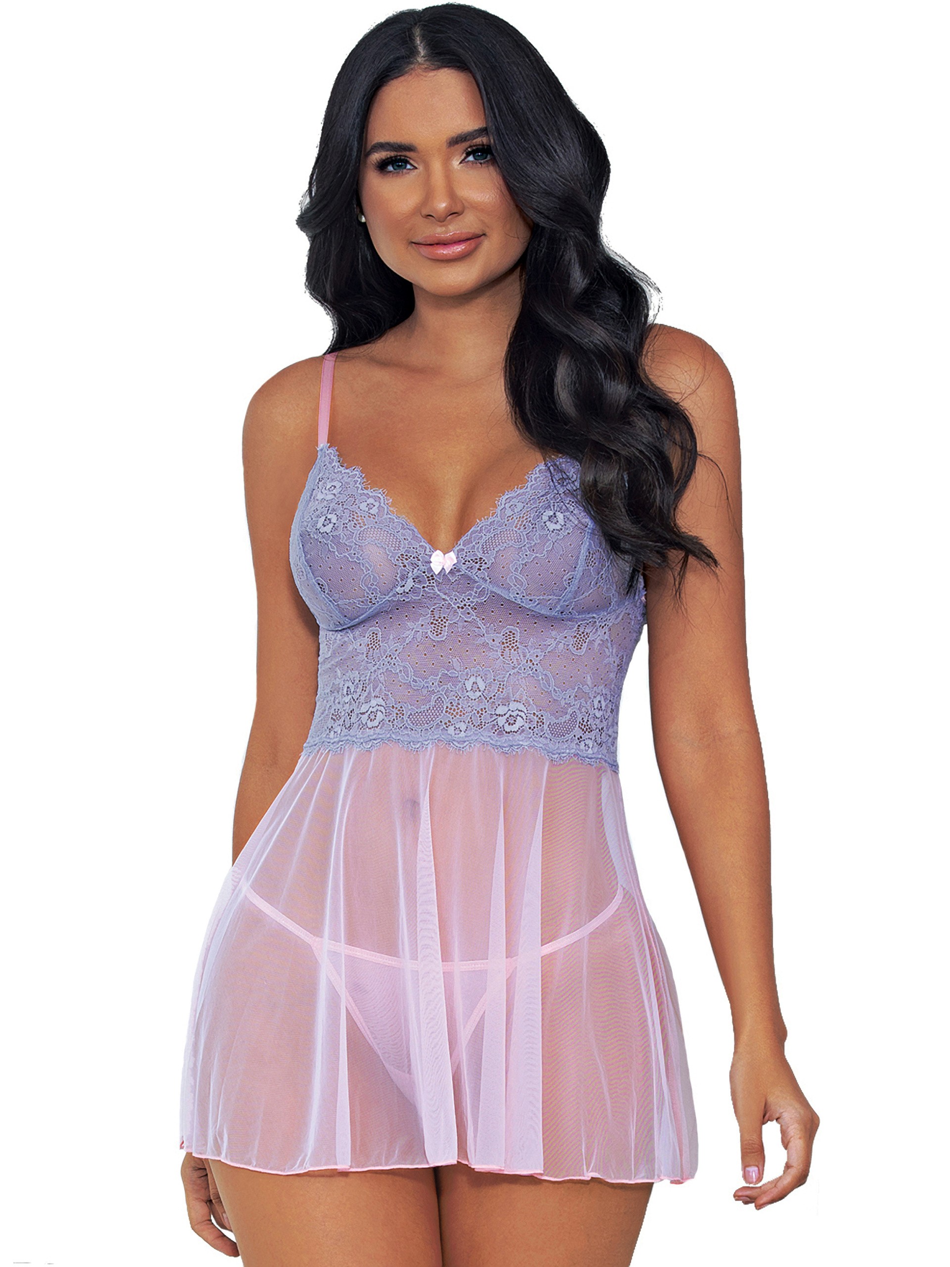 Candy pink mesh, soft lilac lace and a thigh-grazing hemline... this babydoll set is sweet enough to give your lover toothache. Soft cups frame your chest for cleavage-boosting effect, with just a touch of fabric hiding your chests from hungry eyes.