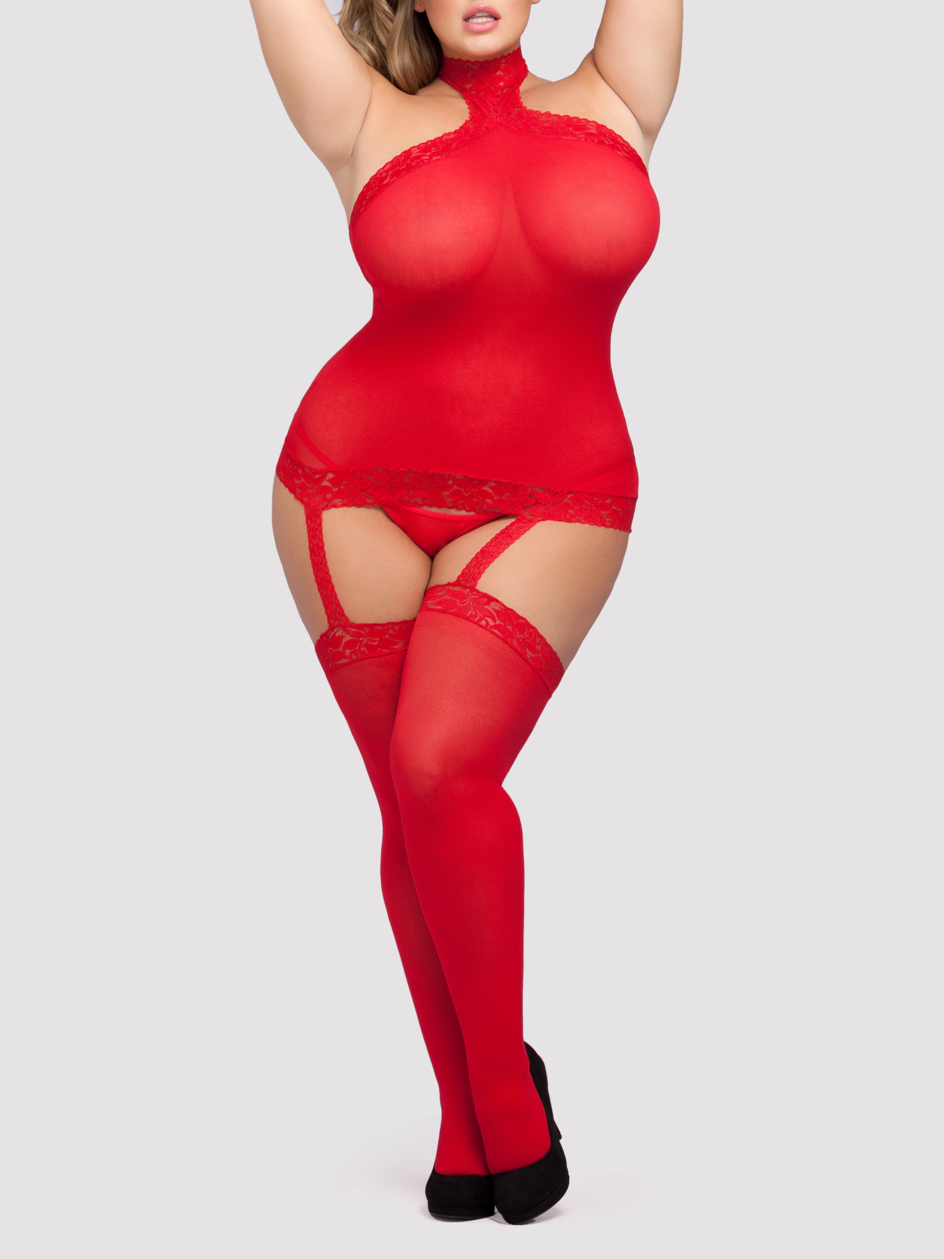 Curve-loving, flattering, and downright stunning, this all-in-one dress and stockings combination is an essential addition to any lingerie drawer. Either simply wear the dress on its own, or wear it beneath your clothes for a cheeky after-dark reveal.