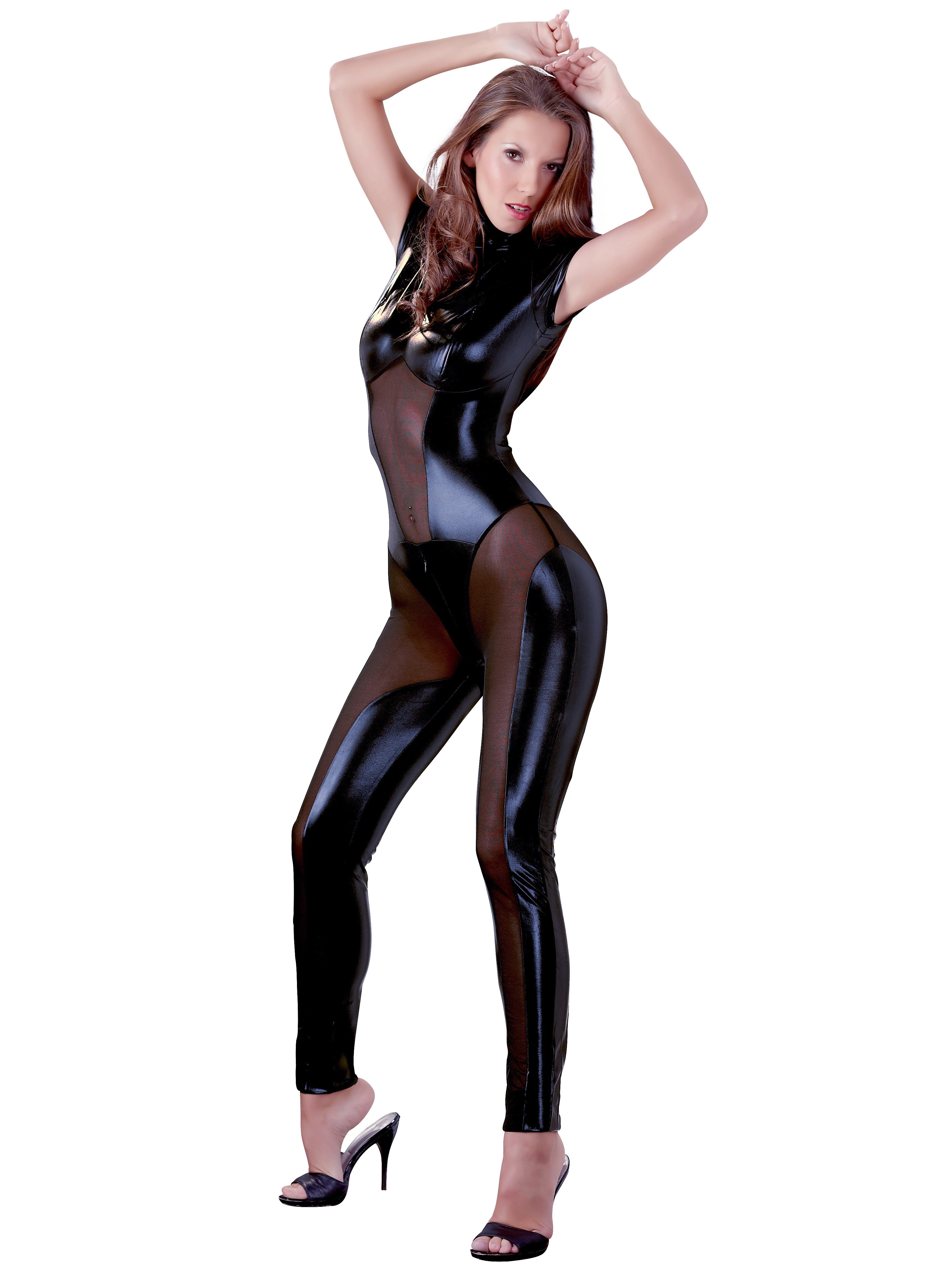 What's sexier than a catsuit? Halle Berry as catwoman in a catsuit. And this wet look catsuit from Cottelli. Wet look fabric punctuated with body-shaping sheer lace panels show off your body, as concealed zips in naughty places inspire passionate adventures.
