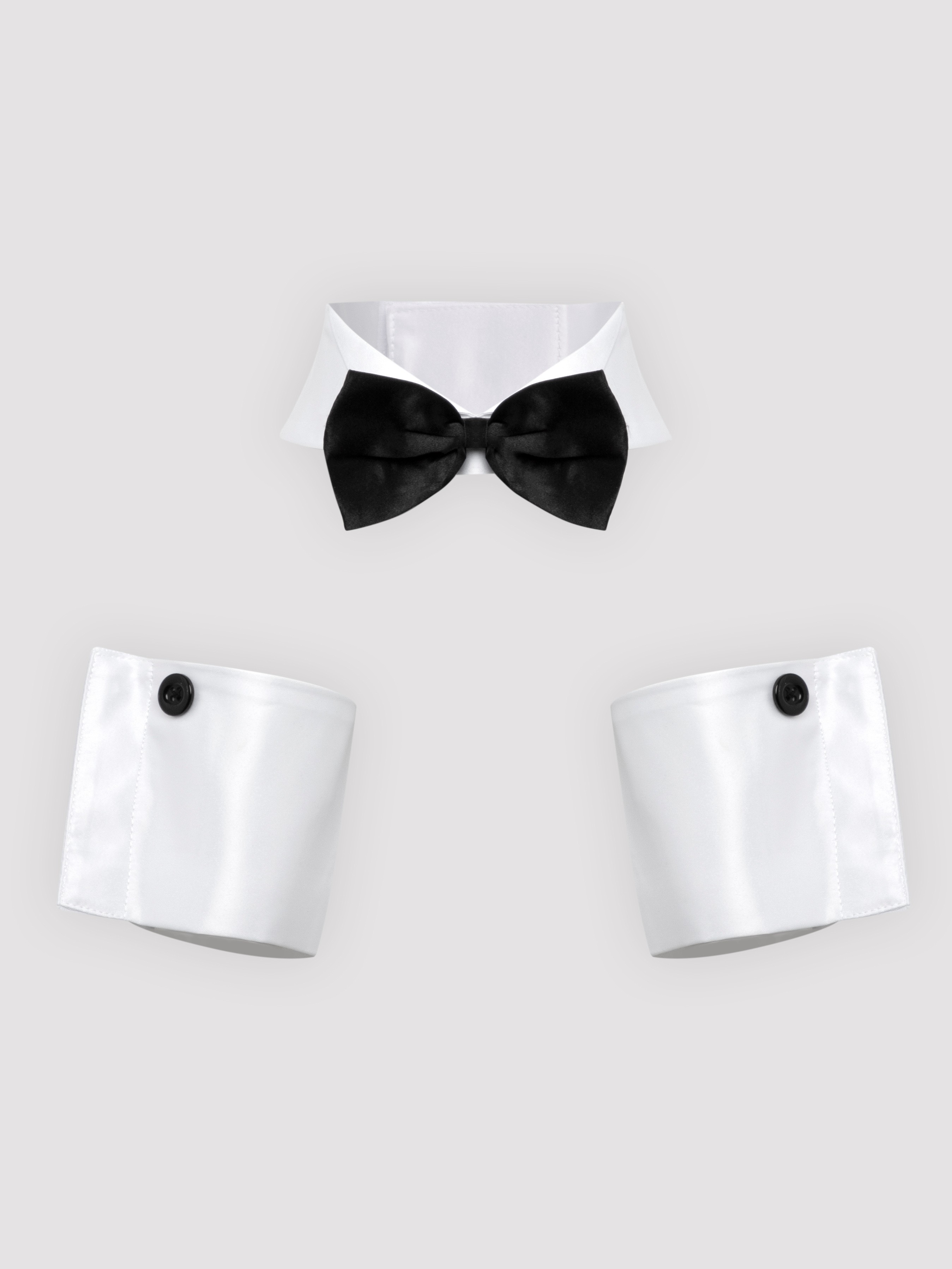 Both the collar and cuffs feature adjustable fastenings to give a comfortable fit for most sizes. A black bow tie at the neck and behindons to the cuffs create a super-alluring formal style, which is finished with soft, smooth satin.