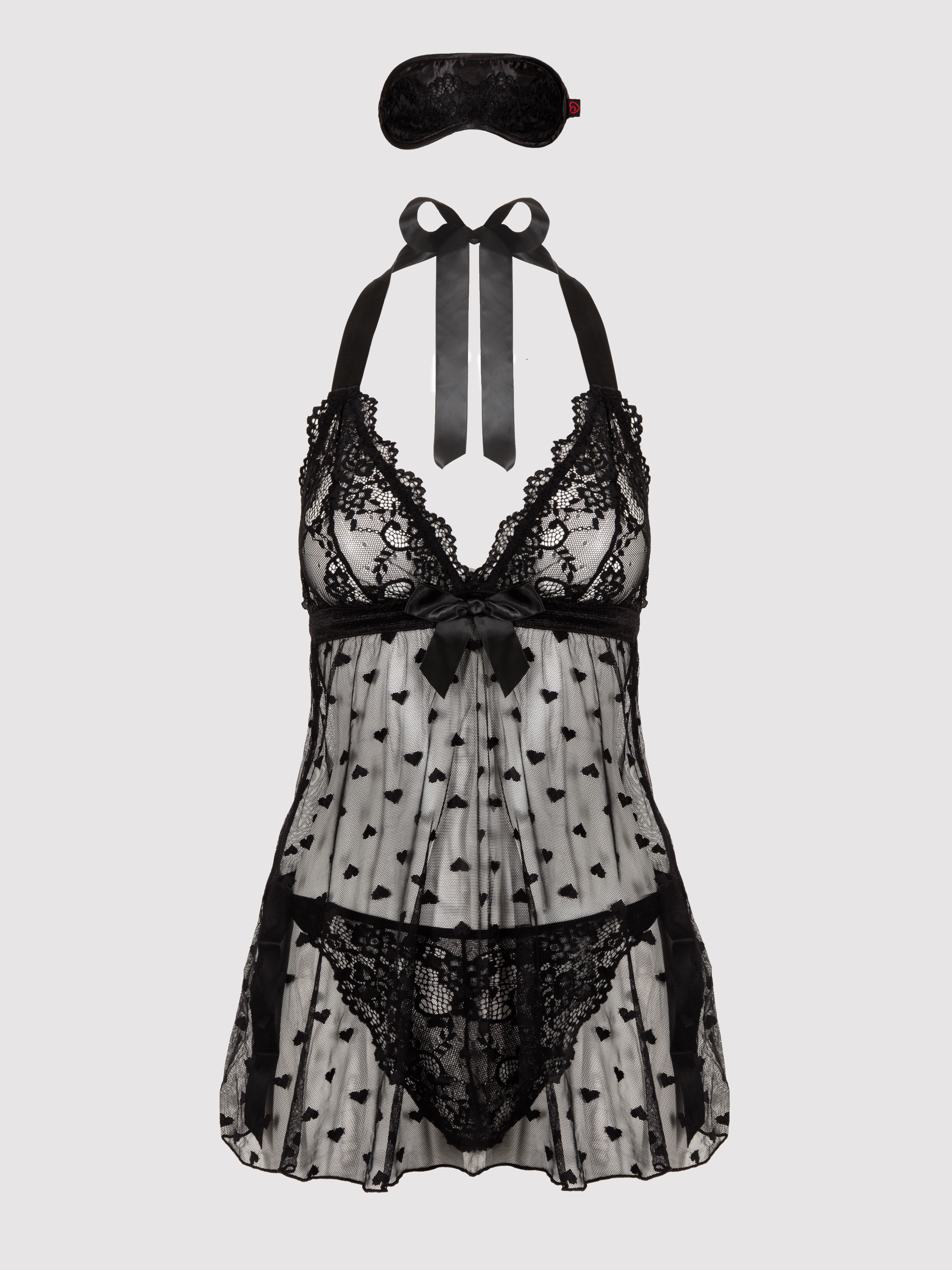 Skip the stress of separate sizes and bestow your beloved with the gift of gorgeous, curve-skimming lingerie that fits. Containing a beautiful halterneck, black lace babydoll and tie-side lace knickers, along with a gift envelope, it's a one-size wonder.