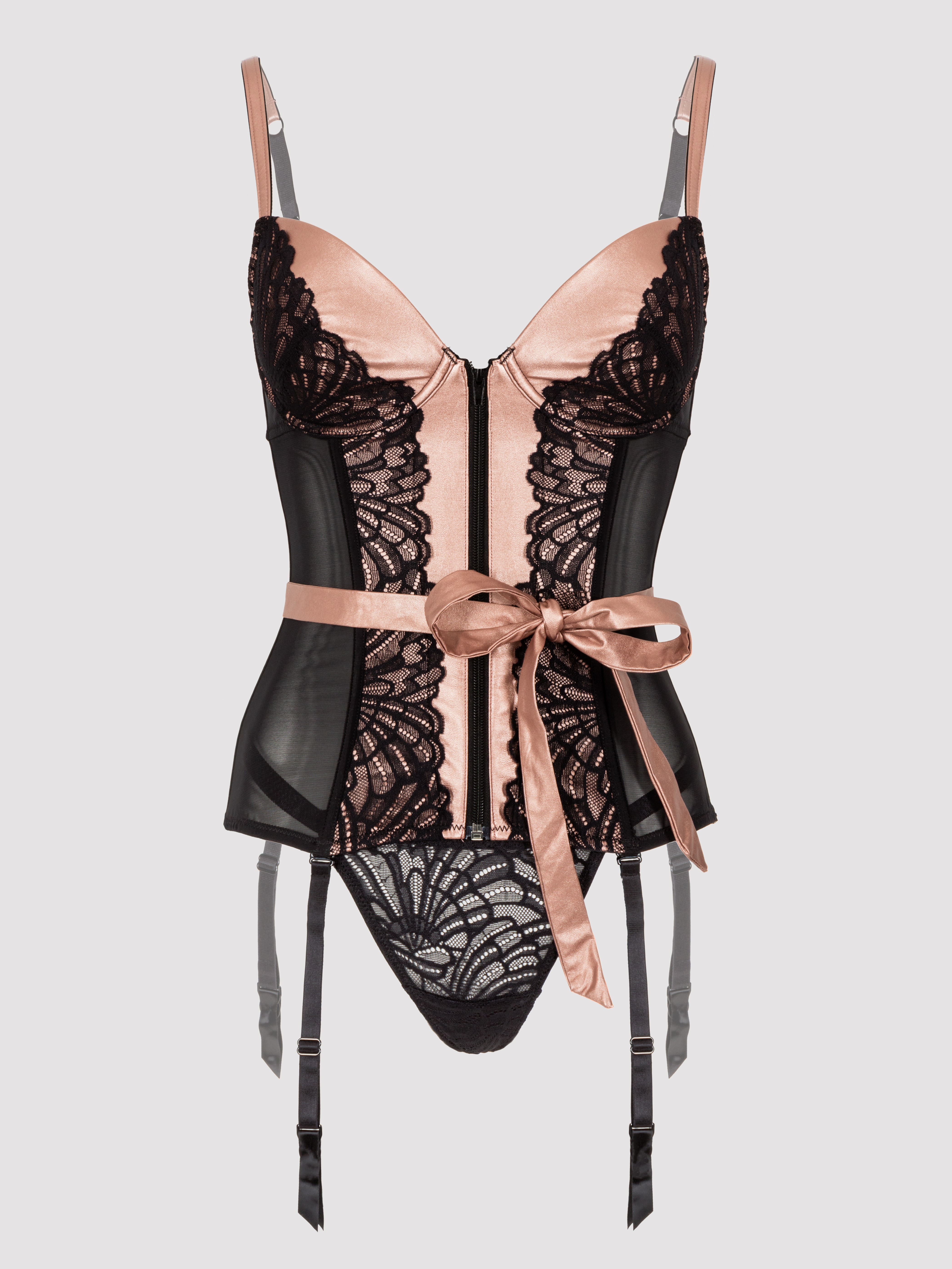 An open-ended front zip offers incredible ease to tease and undress, while hook-and-eye fastenings and adjustable straps give a comfortable fit.