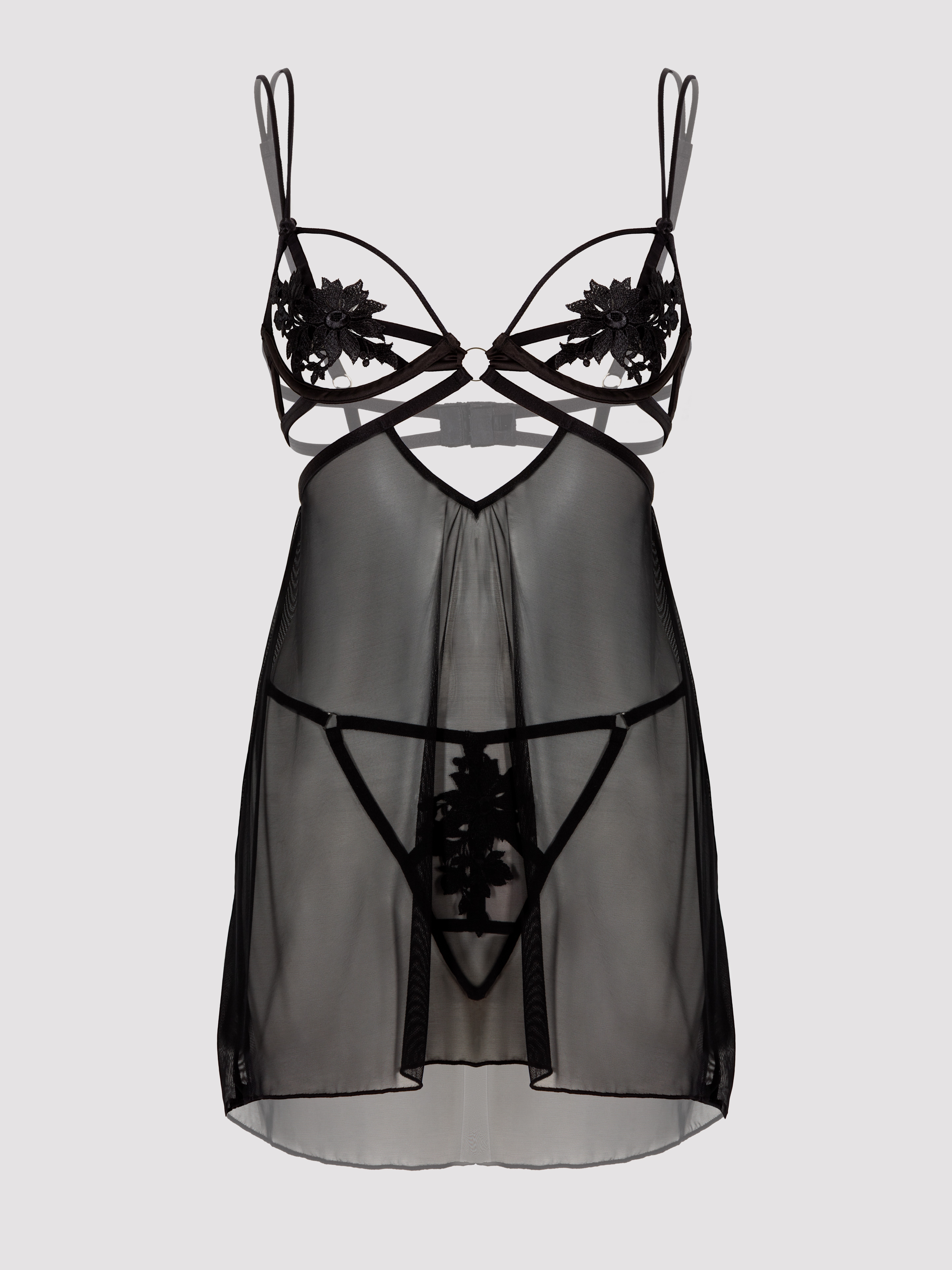 Feel delightfully daring in this luxurious black chemise and pearl G-string set. With a barely-there framing bra boasting beautiful, embroidered motifs, and a cage-style strapping that encases the supporting underwire, your breasts have never been more seductively presented.